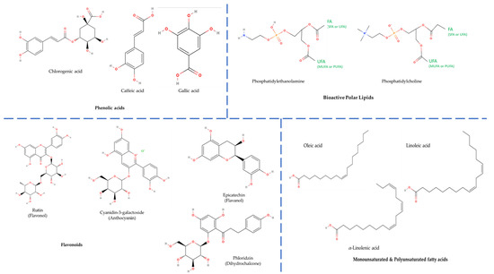The most characteristic phenolic and lipid bioactives associated with the diverse bio-functional health-promoting properties of apple pomace. (Abbreviations: FA = fatty acid; SFA = saturated fatty acid; UFA = unsaturated fatty acid; MUFA = monounsaturated fatty acid; PUFA = polyunsaturated fatty acid). The structures for each individual bioactive were obtained from https://molview.org; accessed on 8 July 2024.