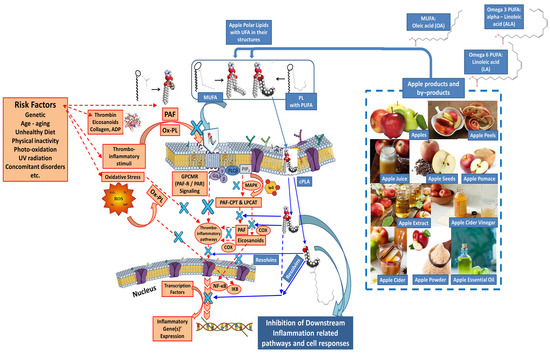 Bio-functional polar lipids (PLs) from apples, apple products and by-products like apple pomace have been found to beneficially affect the inflammatory signaling of PAF and of Ox-PLs by inhibiting the binding of PAF and/or Ox-PLs on a specific G-protein-coupled membrane receptor (PAF-receptor; PAFR) and thus, the PAF-related thrombo-inflammatory signaling that is involved in the aforementioned pathways [4,12,21,22,23]. PL bioactives from apple products and by-products beneficially affect all these signaling pathways, not only through the inhibition of PAF- and thrombin-binding on their receptors and/or through a reduction in the thrombo-inflammatory signaling (after PLs are infused within the cell due to their amphiphilic nature and after their rich UFA content is released by the action of cPLA2), but also by modulating the PAF metabolism and COX 1 and 2 activities to reduce the levels of PAF, eicosanoids and prostaglandins, and increase the levels of resolvins, and thus further inhibit the action transcription factors and the expression of thrombo-inflammatory genes and associated cell responses [22,23,24]. The representative anti-inflammatory activities of such PLs rich in UFA, derived from apple products and by-products, against the thrombo-inflammatory stimuli of PAF and/or Ox-PLs induced by the presence of aging-related risk factors, are shown in Figure 2 (the blue-colored mechanisms in Figure 2).