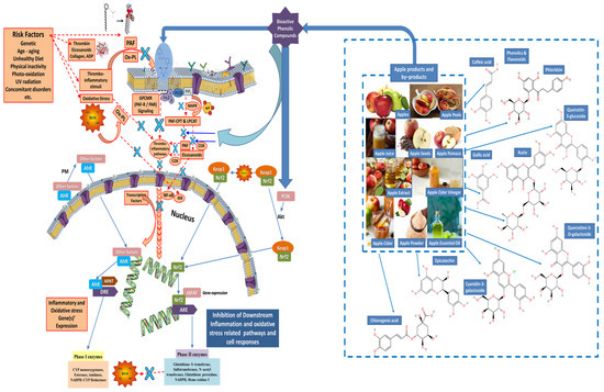 Overall, apple pomace bioactive polar lipids and polar phenolics exhibit their anti-inflammatory and antioxidant health-promoting properties by affecting all these pathways of thrombo-inflammation and oxidative stress, and thus the associated inflammatory manifestations and cell responses linked to aging and chronic disorders [22,23,24].