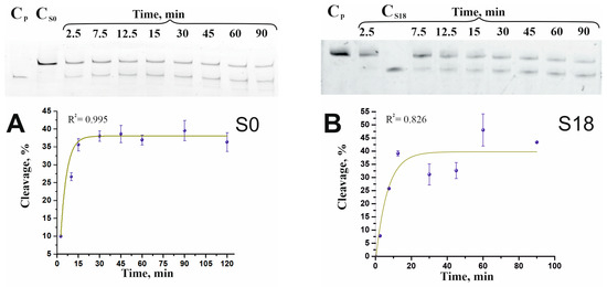 Interesting results were obtained for substrates S18 and S20 (Table 1 and Figure 1). In the case of substrate S18, the cleavage and half-reaction time were comparable to S0, whereas the mismatch in substrate S20 resulted in a significantly higher cleavage (70%) with slightly less half-reaction time as for substrate S0. This phenomenon could be explained by the fact that the mismatch at the edge of the complementary sgRNA sequence site promotes substrate unfolding, facilitating the action of the enzyme. In both in vitro and in vivo studies, it has been shown that Cas9 is able to recognize and cleave DNA targets with mismatches that are located distal to the PAM sequence [26,27,28].