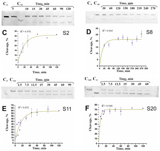 Cleavage assay of 55 bp substrate S0 (A), S18 (B), S2 (C), S8 (D), S11 (E), and S20 (F) analyzed by denaturing 15% polyacrylamide gel electrophoresis, and representation of time dependence of cleavage on graphs. Cleavage was performed using 2 nM FAM-labeled dsDNA and 50 nM complex Cas9/sgRNA (ratio 1:25): Cp—product reaction control (32 bp); CS0, CS2, CS8, CS11, CS18, CS20—DNA substrate control. The data were averaged from three independent experiments. The degree (%) of cleavage and the error are given in Table 1. Blue dots represent experimentally obtained values of substrate cleavage; green lines are the result of fitting by the theoretical model.