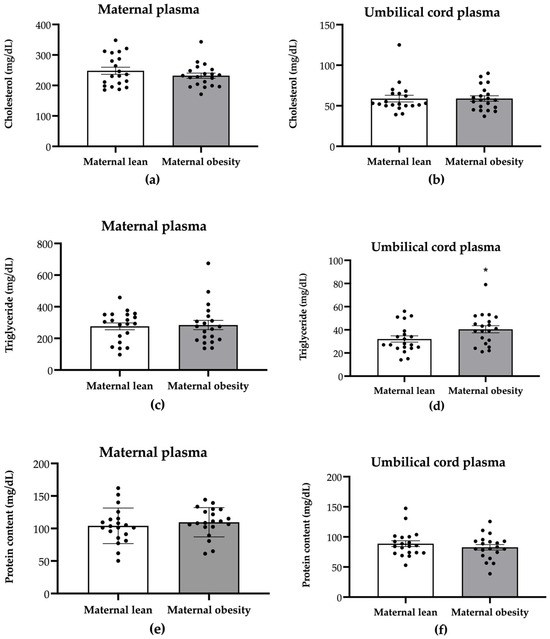 Maternal plasma and umbilical cord plasma levels of total cholesterol (a,b), triglyceride (c,d), and protein (e,f) in maternal lean and maternal obesity groups. Results are expressed as mean ± SEM, n = 20 each. p-value was tested using Student’s t-test; * p < 0.05 relative to the maternal lean group.