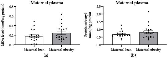Levels of (a) malondialdehyde (MDA) and (b) protein carbonyl in the maternal plasma of the maternal lean and maternal obesity groups. Results are expressed as mean ± SEM; n = 20 each. p-value was tested using Student’s t-test.