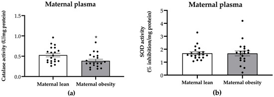 Activity of (a) catalase and (b) superoxide dismutase (SOD) in the maternal plasma of the maternal lean and maternal obesity groups. Results are expressed as mean ± SEM; n = 20 each; p-value was tested using Student’s t-test; * p < 0.05 relative to the maternal lean group.