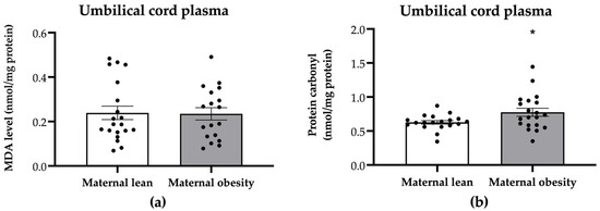 The oxidative stress markers in umbilical cord plasma are presented in Figure 4. The protein carbonyl levels were significantly higher in the umbilical cord plasma of the maternal obesity group compared to the maternal lean group (p = 0.0291; Figure 4b). However, there were no significant differences in umbilical cord plasma MDA levels between the maternal obesity group and the maternal lean control (p = 0.9162; Figure 4a).