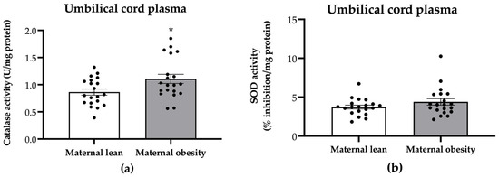 Activity of (a) catalase and (b) superoxide dismutase (SOD) in the umbilical cord plasma of the maternal lean and maternal obesity groups. Results are expressed as mean ± SEM; n = 20 each. p-value was tested using Student’s t-test; * p < 0.05 relative to the maternal lean group.