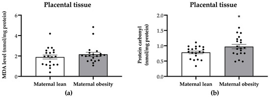 Level of (a) malondialdehyde (MDA) and (b) protein carbonyl in the placental tissue of the maternal lean and maternal obesity groups. Results are expressed as mean ± SEM; n = 20 each; p-value was tested using Student’s t-test. * p < 0.05 relative to the maternal lean group.