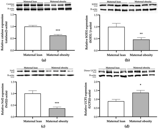 Placental protein expression of (a) catalase, (b) SOD2, (c) Nrf2, and (d) UCP2, measured using Western blot analysis in the maternal lean and maternal obesity groups (n = 12/group). Results are expressed as mean ± SEM; n = 12 each; p-value was tested using the Man–Whitney test; * p < 0.05, ** p < 0.01, *** p < 0.001 relative to the maternal lean group.