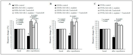 Previous studies [] carried out in NWRs demonstrated that a 30-min hypoperfusion caused a significant reduction in pial arteriolar diameter. During the reperfusion, arterioles underwent a rapid succession of events: vasoconstriction, vasodilation and finally vasoconstriction that lasted at least for 60 min. In the present study, we analyzed the arteriolar diameter at 60 min of reperfusion. As expected, the control sub-group in each experimental group showed a significant diameter decrease (p < 0.0001) with respect to the baseline condition (basal, Figure 1), while all treatments caused a significant vasodilation in all groups (Figure 1) (p < 0.0001 vs. basal for all sub-groups). The diameter increase was greater in SHRs (Figure 1A) and DIHRs (Figure 1B) than in NWRs (Figure 1C) after L-arginine and L-arginine plus Taurisolo® treatments. In the former case, in SHRs, there was a marked increase in arteriolar diameter by 38.0 ± 3.6% of baseline (p < 0.01 vs. basal), in DIHRs by 40.0 ± 3.8% of baseline (p < 001 vs. basal), while in NWRs the increase was 30.0 ± 2.5% of baseline (p < 0.01 vs. basal); in the latter case, in SHRs the arteriolar diameter increased by 30.1 ± 2.8% of baseline (p < 0.01 vs. basal), in DIHRs by 37.5 ± 2.6% of baseline, and in NWRs only by 15.0 ± 2.0% of baseline. The treatment with Taurisolo® alone increased the arteriolar diameter less effectively even if statistically significant in SHRs (8.0 ± 1.2% of baseline, p < 0.05 vs. basal) and DIHRs (15.5 ± 0.4% of baseline, p < 0.01 vs. basal) than in NWRs (18.7 ± 2.5% of baseline, p < 0.0001 vs. basal) (Figure 1C).