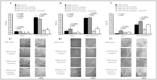 Microvascular permeability. (A) SHRs, (B) DIHRs, and (C) NWRs. The increase in microvascular permeability is reported as normalized gray levels (NGLs) in basal conditions (basal) and at 60 min of reperfusion. For each group, the effects of the different treatments, normal diet (control), L-arginine, Taurisolo® and L -arginine plus Taurisolo® are shown. Interestingly, in basal conditions and at 60 min of reperfusion, control SHRs and control DIHRs showed a significant increase in microvascular permeability compared with control NWRs (black column); L-arginine treatment (gray columns) did not significantly prevent the increase in leakage compared with control, while Taurisolo® (light gray columns) and L-arginine plus Taurisolo® (white columns) treatments protected pial microvasculature, reducing the microvascular permeability more with respect to the other treatments also in NWRs. (A1–C1) are computer-assisted images of pial microvascular networks in an SHR, DIHR and NWR, respectively, for each sub-group in basal conditions and at 60 min’ reperfusion.