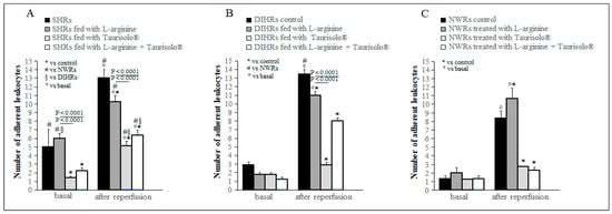 In basal conditions, in control SHRs there was a significantly higher number of leukocytes adherent to venular walls ((13.00 ± 1.00/100 µm venular wall), p < 0.0001 vs. NWRs) (Figure 3A) than in NWRs (2.00 ± 0.30/100 µm venular wall). L-arginine treatment did not modify the leukocytes’ adhesion with respect to control in all three groups of rats considered, while the treatment with Taurisolo® alone and in association with L-arginine produced a significant reduction of leukocytes adherent to venular walls only in SHRs ((5.00 ± 0.60/100 µm venular wall), in Taurisolo®-treated SHRs, p < 0.0001 vs. control; (6.00 ± 0.60/100 µm venular wall) in L-arginine plus Taurisolo®-treated SHRs, p = 0.0023 vs. control) (Figure 3A). At 60 min of reperfusion, the number of leukocytes adherent to venular walls significantly increased with respect to basal conditions in all groups of rats (Figure 3). L-arginine treatment significantly decreased the number of leukocytes adherent in both SHRs ((10.00 ± 0.80/100 µm venular wall), p = 0.023 vs. control) and DIHRs ((11.00 ± 0.40/100 µm venular wall), p = 0.0146 vs. control), while in NWRs it caused a significant augmentation ((11.00 ± 1.20/100 µm venular wall), p = 0.0254 vs. control). Taurisolo® treatment alone ((5.00 ± 0.60/100 µm venular wall) in SHRs, p = 0.0023 vs. control; (3.00 ± 0.30/100 µm venular wall) in DIHRs, p < 0.0001 vs. control); ((3.00 ± 0.01/100 µm venular wall) in NWRs, p < 0.0001 vs. control) and in association with L-arginine ((6.00 ± 0.60/100 µm venular wall) in SHRs, p < 0.0001 vs. control; (8.00 ± 0.40/100 µm venular wall) in DIHRs, p < 0001 vs. control; (2.00 ± 0.30/100 µm venular wall) in NWRs, p < 0.0001 vs. control) determined a significant reduction in the leukocyte adhesion in all groups of rats considered with respect to controls (Figure 3).