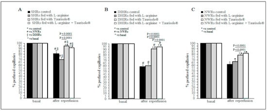 As previously described [], at the end of reperfusion the capillary network was markedly impaired. A reduction in the number of capillaries perfused is evident in Figure 4 where in all control sub-groups the percentage of perfused capillaries was significantly reduced compared with the basal condition (p < 0.0001). The L-arginine treatment significantly improved the capillary perfusion only in NWRs (37.50 ± 1.50% reduction in control with respect to baseline, 32.00 ± 1.00% reduction in L-arginine-treated NWRs with respect to baseline, p < 0.0001) (Figure 4C), while the treatment with Taurisolo® alone and in association with L-arginine preserved, although not totally, the capillary perfusion in all group of animals and particularly in SHRs (Figure 4A) and DIHRs (Figure 4B) (p < 0.0001). In particular, in Taurisolo®-treated SHRs, the reduction in perfused capillaries was by 5.50 ± 1.00% of baseline and in L-arginine and Taurisolo®-treated SHRs by 9.30 ± 1.50% of baseline. In Taurisolo®-treated DIHRs, the decrease in perfused capillaries was by 9.00 ± 1.00% of the baseline and in L-arginine plus Taurisolo®-treated DIHRs by 6.50 ± 1.00% of baseline.