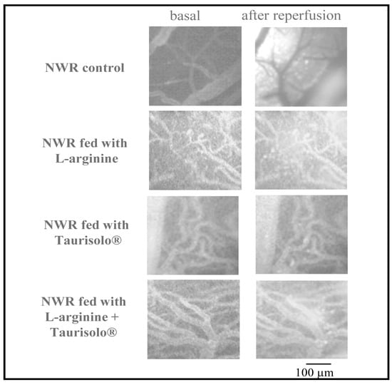 The results of the present study indicate that arterial blood hypertension can worsen microvascular hypoperfusion and reperfusion damage in hypertensive animal models. However, it is conceivable to suggest that protection from damage due to hypoperfusion–reperfusion can be improved not only by a reduction in arterial blood pressure but also by molecules, such as Taurisolo®, effective in preserving the integrity of the brain–blood barrier, facilitating cerebral blood flow and preventing the reduction of capillary perfusion, as well as the damage due to adhesion of leukocytes to venular walls. Interestingly, the parameters specifically ameliorated by Taurisolo® (and not by L-arginine) seem to point toward the bioactive fraction of this nutraceutical acting mostly by inhibiting uncoupled eNOS. It has indeed been shown that antioxidants are able to inhibit uncoupled eNOS either by mitigating oxidative stress or by re-establishing the correct redox state of eNOS cofactors (tetrahydrobiopterin, BH4) or of its iron heme moiety, the latter coordinating oxygen molecules during the conversion of L-arginine to NO.