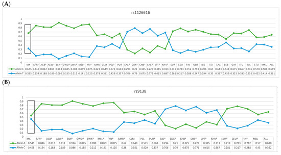 Allelic frequency comparison of the rs1126616 (A) and rs9138 (B) variants of the SPP1 gene in the Mexican-Mestizo with reference group from other populations. MX = Mexican-Mestizo population from our study; ACB = African Caribbean in Barbados; ASW = African ancestry in the southwest US; ESN = Esan in Nigeria; GWD = Gambian in Western Division, The Gambia; MSL = Mende in Sierra Leone; YRI = Yoruba in Ibadan, Nigeria; CLM = Colombian in Medellin, Colombia; MXL = Mexican ancestry in Los Angeles, California; PEL = Peruvian in Lima, Peru; PUR = Puerto Rican in Puerto Rico; CDX = Chinese Dai in Xishuangbanna, China; CHB = Han Chinese in Beijing, China; CHS = Southern Han Chinese, China; JPT = Japanese in Tokyo, Japan; KHV = Kinh in Ho Chi Minh City, Vietnam; CEU = Utah resident with northern and western European ancestry; GBR = British in England and Scotland; BEB = Bengali in Bangladesh; ITU = Indian Telugu in the UK; STU = Sri Lankan Tamil in the UK. * Data with atheistic in Figure 1A,B represents the population that was different when compared with the data of the present study. Data are presented in Figure 1 and in the text; frequencies were taken from Ensambl, a database using the reference genome “CRCh38.p13.” The allele frequencies of different populations were taken from Ensambl. https://www.ensembl.org/Homo_sapiens/Variation/Population?db=core;r=4:87982201-87983201;v=rs1126616;vdb=variation;vf=90919299 (accessed on 29 October 2023) *. https://www.ensembl.org/Homo_sapiens/Variation/Explore?r=4:87982690-87983690;v=rs9138;vdb=variation;vf=90271607 (accessed on 29 October 2023) *.