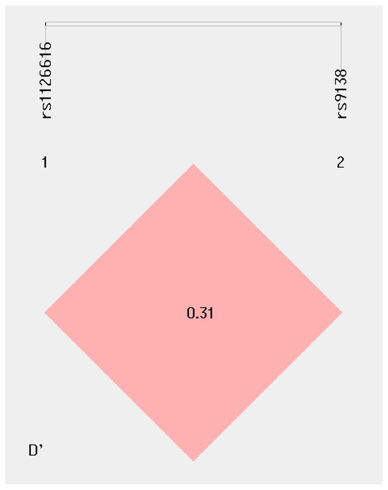 Allele frequencies were obtained by direct counting. A goodness-of-fit Chi-square test assessed the Hardy–Weinberg equilibrium to compare the observed genotype frequencies with the expected frequencies among control subjects. Odds ratios (OR) and 95% confidence intervals (CI) were calculated. A two-tailed p < 0.05 was considered statistically significant. The association analysis of the OR and the binary logistic regression analyses among the studied groups were performed using PASW Statistic Base 24, software, 2021 (Chicago, IL, USA). The SHEsis Online Version program analyzed pair-wise linkage disequilibrium (D′) and haplotype frequency.