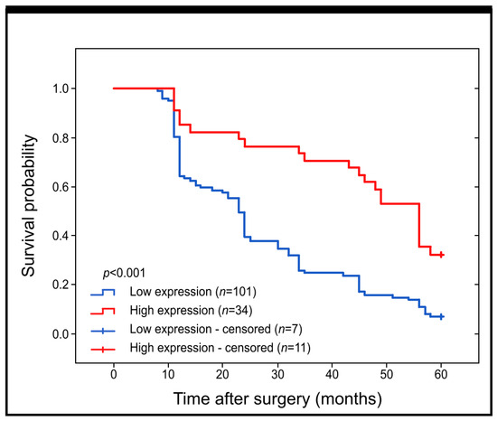Our research aimed to investigate whether the presence of Grx1 protein has any effect on the survival rate of patients with colon adenocarcinoma, with a specific focus on its association with 5-year survival. We used Kaplan–Meier survival curves to analyze all samples. Our findings indicate that patients with higher expression of Grx1 had a significantly better 5-year survival rate than those with lower levels of this protein detected through immunohistochemical reaction (log-rank, p < 0.001) (as depicted in Figure 2).