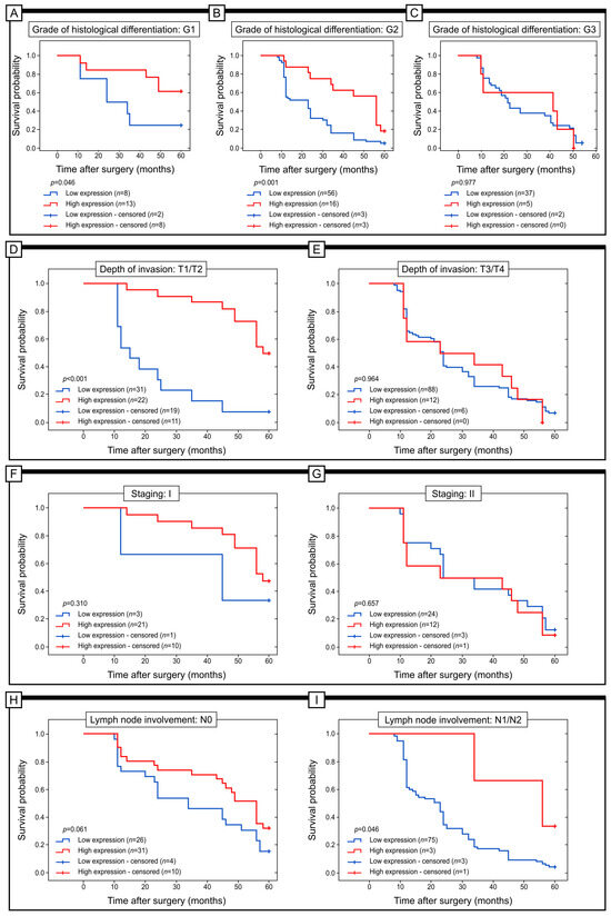 Kaplan–Meier curves showing the survival probability of patients stratified according to the degree of histological differentiation (A–C); depth of invasion (D,E); staging (F,G); lymph node involvement (H,I) in colon adenocarcinoma samples with high or low Grx1 immunohistochemical expression.