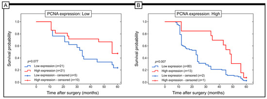 The results showed that Grx1 protein expression did not significantly affect the 5-year survival rates of patients in G3 (log-rank test; p = 0.977). However, in patients classified as G1 and G2, higher levels of Grxr1 expression were associated with better 5-year survival (log-rank test; p = 0.046 and p = 0.001, respectively). Similar results were observed in patients with T1/T2 and T3/T4 disease depths. In the T1/T2 group, the high level of Grx1 expression was connected with a better prognosis (log-rank test; p< 0.001). In the T3/T4 group, we did not find statistical significance (log-rank test; p = 0.964, respectively). Moreover, we did not find any statistical significance connected with the 5-year survival and Grx1 expression when we stratified patients according to the stage of the disease, e.g., stages I, II, III (log-rank test; p = 0.310, p = 0.657, p = 0.637, respectively). The high immunohistochemical expression of Grx1 protein was also related to better survival in patients with high expression of PCNA protein (log-rank test; p = 0.007) (Figure 4).