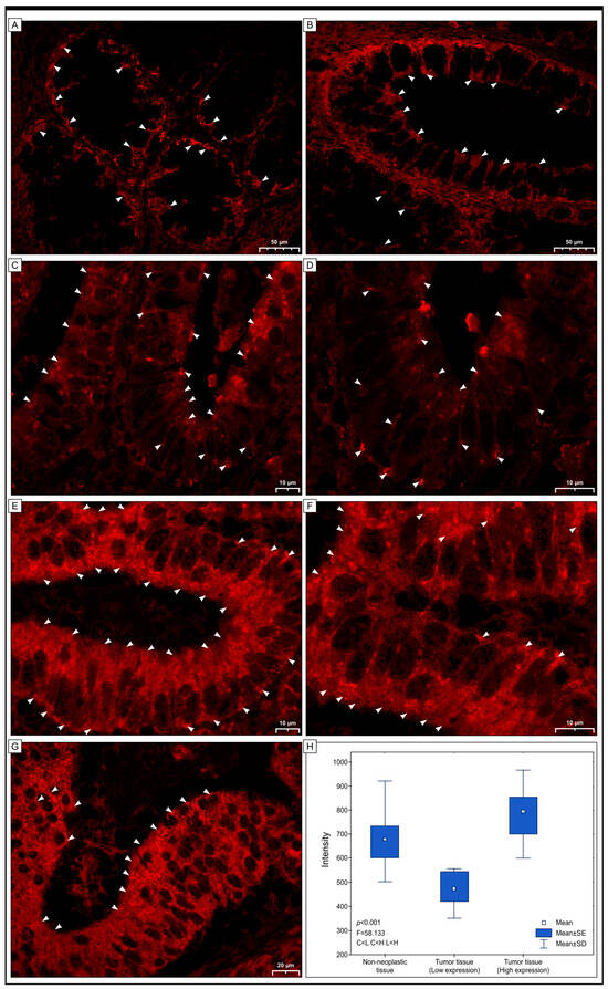 The images below visualize Grx1 protein expression in colon adenocarcinoma (C–G) and non-cancerous margins (A,B) through immunofluorescence. A red fluorescent signal of variable intensity, showing the expression of Grx1 in the cytoplasm of colon cells and carcinoma cells (C–G), is seen in the cells of non-pathological mucosa (A,B). The fluorescent signals were located in the cytoplasm of the apical regions of several cancer cells, suggesting the detection of Grx1. In contrast, in some cells, the fluorescence was intense throughout the cytoplasm of the cells (arrowheads) or in the nuclei (arrows). ANOVA results (H) reveal the difference in intensity of the red signal representing the Grx1 presence between the groups tested; C > L, C < H, L < H. The intensity differences are between groups; C represents colon tissue without pathological alterations, L is adenocarcinoma tissue with low Grx1 expression, and H is adenocarcinoma tissue with high-intensity Grx1 expression.