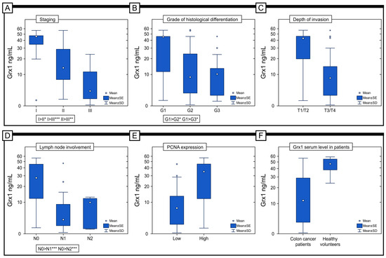 Comparison of serum Grx1 concentrations in colon adenocarcinoma patients according to the staging (A), grade of histological differentiation (B), depth of invasion (C), lymph node involvement (D), and immunohistochemical expression of PCNA protein (E). (F) The concentration of serum level in colon adenocarcinoma patients and healthy volunteers. * p< 0.05, ** p< 0.01, *** p < 0.001.