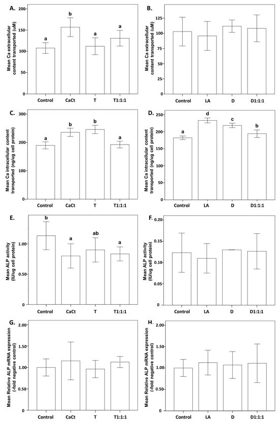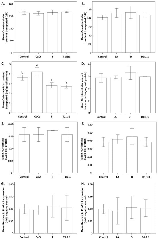 Impact of calcium citrate (CaCt), the probiotic Lactobacillus acidophilus (LA), daidzein (D), tempeh (T), and the combinations of tempeh, calcium citrate, and the probiotic L. acidophilus (T1:1:1) and of daidzein, calcium citrate, and the probiotic L. acidophilus (D1:1:1) on extracellular calcium deposition (A,B), intracellular calcium content (C,D), ALP activity (E,F), and ALP mRNA expression (G,H) in Saos-2 cells. The analyzed intestinally permeabilized fractions were introduced into Saos-2 cell cultures throughout the culture medium every 3 days for 15 days. Significant differences between means within each figure are denoted by distinct letters (a–c), and these letters represent comparisons with a significance level of p < 0.05. The values are expressed as means ± standard deviation. Each figure includes a control group with triplicate analyses. This figure exclusively displays statistically analyzed data, highlighting statistically significant differences.