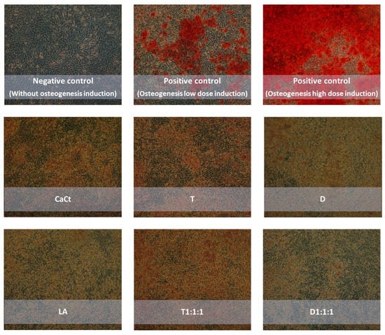 Impact of gastrointestinally digested and intestinally transported calcium citrate (CaCt), probiotic Lactobacillus acidophilus (LA), daidzein (D), tempeh (T), and tempeh (T1:1:1) or daidzein (D1:1:1) mixtures (combinations of tempeh or daidzein, calcium citrate, and probiotic L. acidophilus) on extracellular calcium deposition in Saos-2 cell cultures following a 15-day treatment with osteogenesis inducers. In the negative control, the cells were cultured without any analyzed fractions and osteogenic mixtures. In the positive controls, Saos-2 cells were induced by osteogenic medium addition. Extracellular calcium deposits in the treated Saos-2 cells were determined by the alizarin red staining method. Photos were taken at 100× magnification.