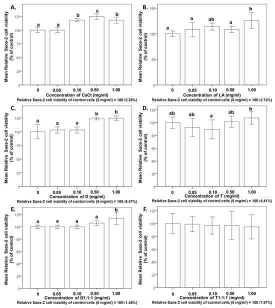 Impact of calcium citrate (CaCt) (A), the probiotic Lactobacillus acidophilus (LA) (B), daidzein (D) (C), tempeh (T) (D), and the combinations of D, CaCt, and LA (D1:1:1) (E) and of T, CaCt, and LA (T1:1:1) (F) on Saos-2 cell proliferation, viability, and metabolic activity determined using the MTT test. The cells were treated with CaCt, LA, D, T, T1:1:1, and D1:1:1 at concentrations ranging from 0.05 mg/mL to 10 mg/mL for 48 h. Significant differences between means within each figure are denoted by distinct letters (a,b or a–c), and these letters represent comparisons with a significance level of p < 0.05. The values are expressed as means ± standard deviation. Statistical analyses were conducted with triplicate measurements for each figure, resulting in different letter notations for significant differences. This figure exclusively displays statistically analyzed data, highlighting statistically significant differences.