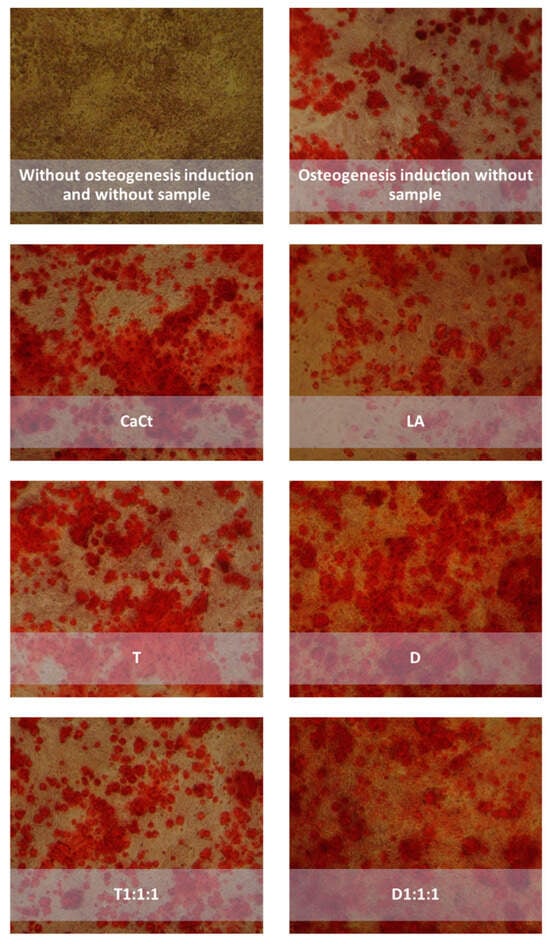 Figure 5 visually presents the influence of calcium citrate, tempeh, daidzein, probiotic, and their combinations on Saos-2 cell cultures treated with an osteogenesis induction mixture (OIM). CaCt, T, LA, D, and D1:1:1 significantly increased the intracellular calcium content. Lower ALP activity was observed in differentiated Saos-2 cells under treatment with CaCt and T1:1:1. However, the ALP mRNA expression analysis did not confirm this effect (Figure 4G,H). The other analyzed products did not impact ALP activity following Saos-2 cell differentiation. Similarly, their possible effects on ALP mRNA expression were not detected.