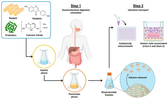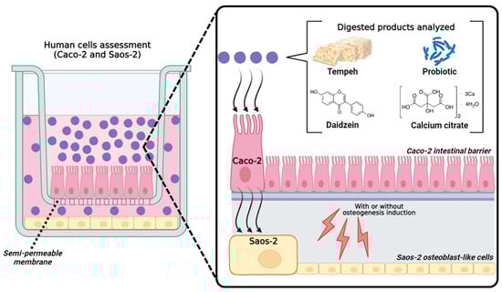 In summary, this study aimed to assess the impact of tempeh, pure daidzein, and Lactobacillus acidophilus on calcium uptake and deposition in Saos-2 cells, with which the bone mineralization process was simulated. In the initial phase, we evaluated calcium bioaccessibility from these nutrients and their combinations through digestion in an artificial gastrointestinal tract. Subsequently, the digested products were subjected to simulated intestinal absorption in the intestinal epithelial Caco-2 cell model, and the intestinal permeable fractions were scrutinized in a culture of osteoblast-like Saos-2 cells. This methodology allowed for exploring the interactions and effects of the studied products on calcium bioavailability and bone-related cellular processes in our experimental models.