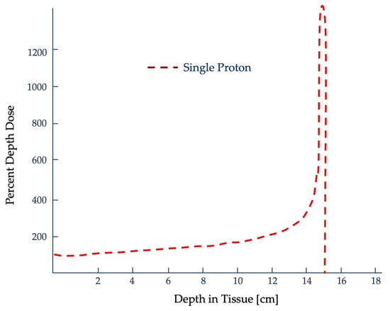 Heavy ion exposures play a critical role in astronaut spaceflight risk assessment. They have a finite range within tissues with minimal dose deposition until the end of the particle track, where nearly all of their energy is delivered []. As a heavy ion barrels through a medium, it loses energy continuously with each interaction, which can impart biological damage []. Most of its energy is deposited within a short distance at the end of its path. Figure 1 shows what is referred to as the Bragg peak, which is used advantageously in radiotherapy [,,]. In terms of biological effects, heavier ions (Z > 3) like carbon are more effective at creating irreparable DNA damage and their efficacy is not dependent on the presence of oxygen, which is a significant advantage when treating radioresistant hypoxic tumors [].