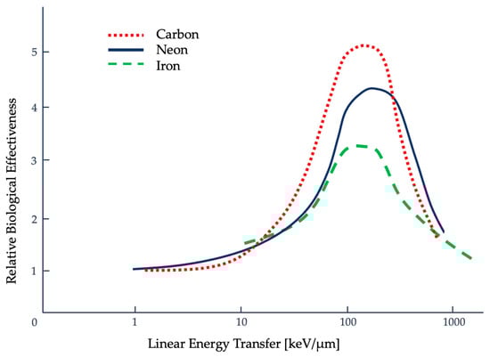 Relationship between relative biological effectiveness (RBE), clonogenic cell death, and LET for mammalian cells with carbon, neon, and iron [,,]. Here, it can be seen that around 100 keV/micron, along the LET axis, there is a peak after which the RBE not only fails to increase but declines. Figure adapted from Sørenson [].