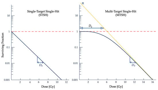 where D is the dose, M is the molecular mass, and N is the number of hits within the target. This model assumed that no “hits” meant cell survival, that each target had an equal probability of being hit by ionizing radiation, and that a single hit was enough to inactivate the target [,]. The MTSH model appropriately follows experimental data in high dose ranges and is described by single- or multi-event killings, shown by the curved and linear portions of the curve, respectively [].