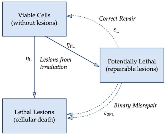The lethal–potentially lethal (LPL) model formulated by Curtis further built upon the foundation that nuclear DNA is the primary target of ionizing radiation. Figure 4 visualizes the LPL model with η as the implicit dose rate and ε as the repair rate, which is assumed constant; the repair mechanisms work at a fixed rate regardless of the concentration of damaged DNA. Potentially lethal (PL) lesions may be repaired and return the cell to the viable, pre-damaged state, or become lethal (L) lesions that result in cell death. The numerical description of the LPL model is shown in Equation (3). While ε and η are implicitly the repair and dose rates, respectively, tr is the total repair time available after exposure to ionizing radiation.