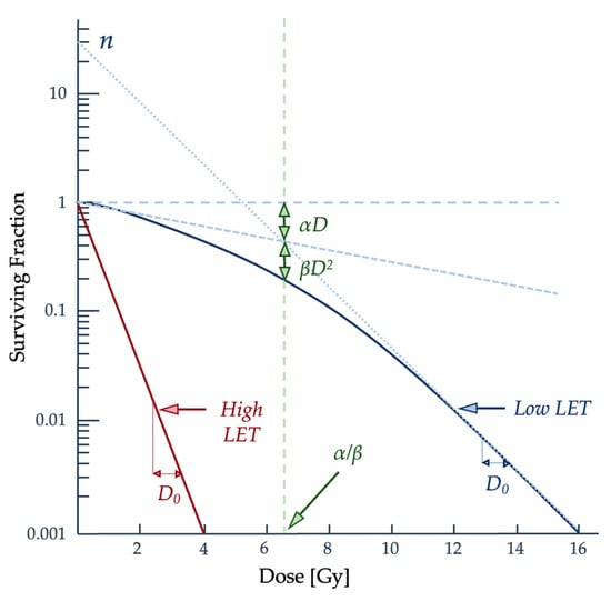 The linearity of the curve on the logarithmic–linear scale represents an exponential relationship between the dose and the surviving fraction []. Densely ionizing radiation, or high LET particles such as α particles and neutrons, is the right-hand curve shown in red and is more likely to result in a linear curve. Sparsely ionizing radiation or low-LET particles such as x-rays will produce more of a shoulder to the curve, as described by Dq [,]. Figure adapted from Hall and Giaccia [].