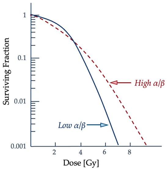 The α term is also used to refer to lethal damage from a single particle and the β term is reserved for the accumulating lethal damage caused by more than a single particle track []. The α/β ratio corresponds to the dose at which each type of damage is equal and is often used to characterize the radiosensitivity of cell lines. Low α/β ratio cell lines have a more pronounced curvature to the cell survival graph, while higher α/β ratio cell lines show a more constant rate of cell-killing as the dose increases []. How a cell survival curve, or response curve, is produced and whether the cell line is “high α/β” to “low α/β” is contingent upon the radiation conditions and potentially the microenvironment and type of cell. Changes to the cell cycle and target environment for low-LET radiation have been shown to cause shifts in the cell cycle and change a cell population from “high α/β” to “low α/β” []. This comparison of how different cell line types may result in a difference in the resulting cell survival curve can be seen in Figure 6.