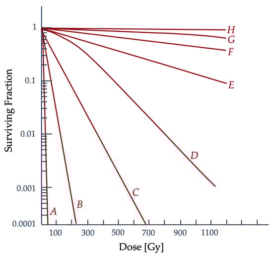 Comparison of different types of cells and their response to ionizing radiation. Shown is a comparison of (A) a mammalian cell line radiation response curve with that of (B) E. coli, (C) E. coli B/r (a mutation of E. coli), (D) yeast, (E) phage staph E, (F) bacillus megaterium (G) potato virus, and (H) M. radiodurans (one of the most radioresistant known organisms) [,]. Figure adapted from Hall and Giaccia [].