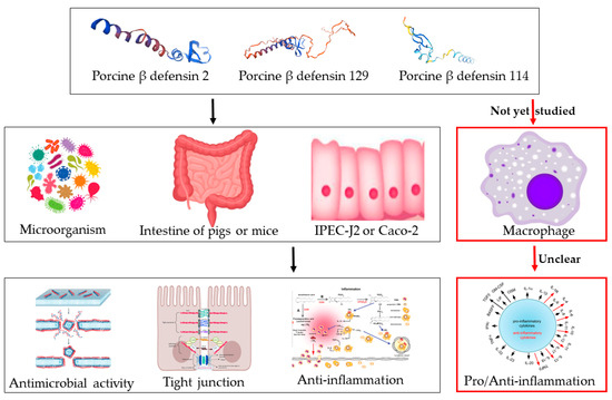 Biological functions of porcine defensins. It has been shown that porcine β-defensins have some antimicrobial activity, and porcine β-defensins 2/129 can enhance the intestinal barrier and inhibit inflammation in the mouse intestine, IPEC-J2, or Caco-2 cells. However, the inflammatory response of porcine defensins to macrophages has not yet been studied, and the mechanism is still unclear.