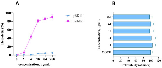 The hemolytic value (A) of pBD114 was measured using 4% porcine erythrocytes, which were incubated with 1, 4, 16, 64, and 256 μg/mL pBD114 and melittin for 1 h at 37 °C. RAW264.7 was treated with pBD114 at final concentrations of 0 (MOCK), 1, 4, 16, 64, and 256 μg/mL for 24 h, and then the cytotoxicity (B) of pBD114 was determined using CCK-8 according to the user’s guide.