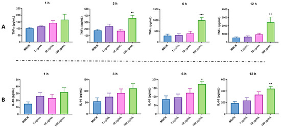 The pro-inflammatory activity of pBD114 on the RAW264.7 cells. The RAW264.7 cells were treated with 0 (MOCK), 1, 10, and 100 μg/mL pBD114 for 1, 3, 6, and 12 h, respectively, and the concentrations of TNFα (A) and IL-10 (B) in the supernatant of cell culture were detected using ELISA. The significance levels are (relative to MOCK) * p < 0.05, ** p < 0.01, and *** p < 0.001.
