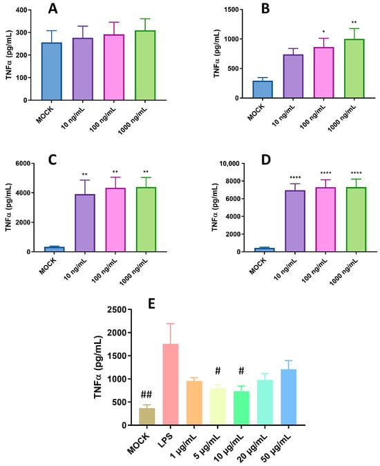 Anti-inflammatory activity of pBD114 on the RAW264.7 cells. The RAW264.7 cells were treated with 0 (MOCK), 10, 100, and 1000 ng/mL LPS for 0.5, 1, 2, and 4 h; the concentration of TNFα ((A) 0.5 h; (B) 1 h; (C) 2 h; and (D) 4 h) in the supernatant of cell culture was detected using ELISA. RAW264.7 cells were co-cultured with 1, 5, 10, 20, and 50 μg/mL pBD114 and 10 ng/mL LPS for 2 h, and the concentration of TNFα (E) in the supernatant of cell culture was detected using ELISA. The significance levels are (relative to MOCK) * p < 0.05, ** p < 0.01, and **** p < 0.0001. The significance levels are (relative to LPS) # p < 0.05, and ## p < 0.01.