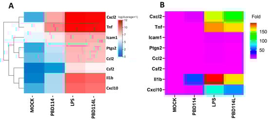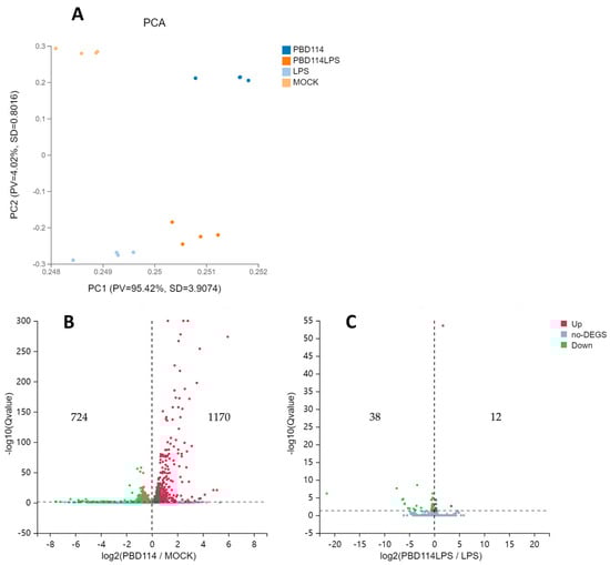 Prior to the analysis of DEGs, principal component analysis (PCA) was performed. The PCA plots show significant differences between the four groups (Figure 5A). From the volcano plots of PBD114/MOCK (Figure 5B), there are 1894 DEGs, including 1170 up-regulated genes and 724 down-regulated genes. From the volcano plots of PBD114LPS/LPS (Figure 5C), there are 50 DEGs, including 12 up-regulated genes and 38 down-regulated genes. Detailed DEGs data are shown in Table S4.
