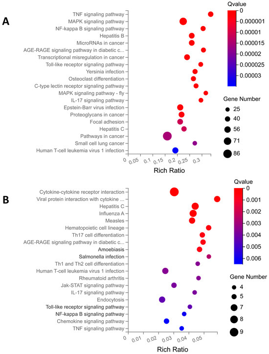 KEGG enrichment analysis of differential expression genes (DEGs) for PBD114/MOCK (A) and PBD114LPS/LPS (B). The X axis is the enrichment ratio (the ratio of the number of genes annotating an entry in a selected gene set to the total number of genes annotating that entry in the species, which is calculated as Rich Ratio = Term Candidate Gene Num/Term Gene Num). The Y axis is the KEGG Pathway, and the size of the bubbles indicates the number of genes annotated to a certain KEGG. The color represents the enrichment significance value (q-value or p-value; see the legend for details). The redder the color is, the smaller the significance value is.