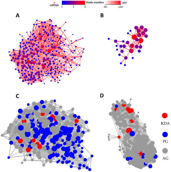 PPI and KDA analyses of differential expression genes (DEGs) for PBD114/MOCK (A,C) and PBD114LPS/LPS (B,D).