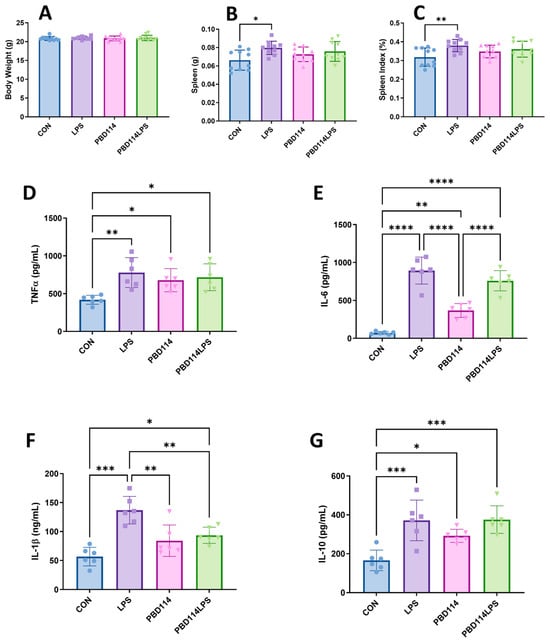 Effects of pBD114 on spleen and serum inflammatory factors in mice. The intraperitoneal injections of LPS (5.0 mg/kg) and pBD114 (5.0 mg/kg) were administered in mice for 12 h. Their body weight (A), spleen weight (B), and spleen index (C) were calculated, and the concentrations of the TNFα (D), IL-6 (E), IL-1β (F), and IL-10 (G) proteins in the mice serum were measured by ELISA. The significance levels are * p < 0.05, ** p < 0.01, *** p < 0.001, and **** p < 0.0001.