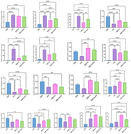 Effects of pBD114 on the gene expression level of the mouse spleens. The significance levels are * p < 0.05, ** p < 0.01, *** p < 0.001, and **** p < 0.0001.