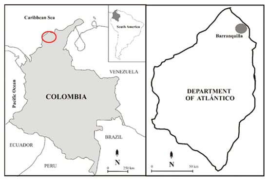 Atlántico Department of Colombia. On the left: a map of Colombia with a red mark showing the region from which the sample was taken. On the right: Colombia’s Atlántico Department with the city of Barranquilla.