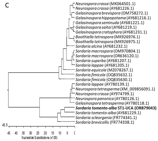 Subsequently, this endophytic fungus isolated from G. sepium was identified by the identification service of the Spanish Type Culture Collection (CECT), by means of both morphological and molecular methods, as Sordaria tomento-alba. The isolate exhibits the macroscopic and microscopic characteristics typical of the family Sordariacea especified species. Neighbor-joining phylogenetic analysis was conducted using the Kimura two-parameter model and a bootstrap test with 5000 runs (MegAlign, DNASTAR® Lasergene package v. 7.1.0). The sequences of related fungal species/genus were downloaded from the GenBank database, from the family Sordariacea, to which Sordaria belongs. The phylogenetic trees shown in Figure 2 were constructed using (i) forty-six sequences, including six genera and twenty-five species, for the ribosomal DNA region comprising the intergenic spaces ITS1 and ITS2, including the 5.8S rRNA (Figure 2A); (ii) forty-three sequences, including five genera and twenty-four species, for the 28S rRNA gene (Figure 2B); and (iii) twenty-six sequences, including four genera and nineteen species, for the beta-tubulin gene (Figure 2C). Based on all these studies, it was determined that strain ST1-UCA is clearly grouped with the species Sordaria tomento-alba (Figure 2).