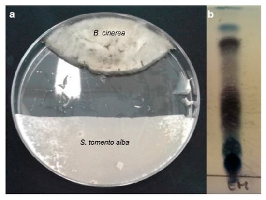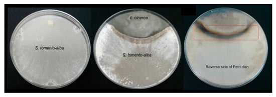 During co-cultivation, a dark-colored zone was observed in the back of the Petri dish in the area of interaction between the two microorganisms (Figure 3, red box). This suggests an increase in the production of metabolites in this area. This dark zone of interaction remained unchanged after several weeks of co-culture as neither of the microorganisms was able to overcome the other. This pattern coincides with that proposed by Bertrand et al. (2014), who noted that four main types of interactions can occur during a confrontation between microorganisms in a solid culture medium: (a) remote inhibition, (b) zone of confrontation (c) contact inhibition, and (d) over-growth []. A confrontation zone was clearly observed in the case of S. tomento-alba versus B. cinerea B05.10 (Figure 3, red box).