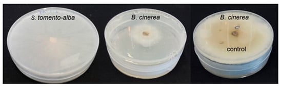 Two strains were used in this study: the wild-type B. cinerea B05.10 and one strain of fungus identified in this study as S. tomento-alba (Table 4). Potato dextrose agar (PDA) medium (Condalab S.A., Torrejón de Ardoz, Madrid, Spain) was used for routine fungal cultures. The cultures were incubated at 25 °C under 24 h daylight.