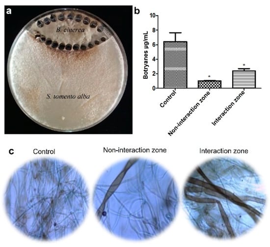 Co-culture of S. tomento-alba and B. cinerea B05.10. (a) Parts described as “non-interaction and interaction zones”; (b) production of botryanes from non-interaction and interaction zones in comparison to the B. cinerea B05.10 control. Data are expressed as the mean of three replicates ± SDs. Asterisks indicate statistically significant differences of each treatment when compared to the control (p < 0.05). (c) Microscopic characteristics of B05.10 hyphae from control, non-interaction, and interaction zones.